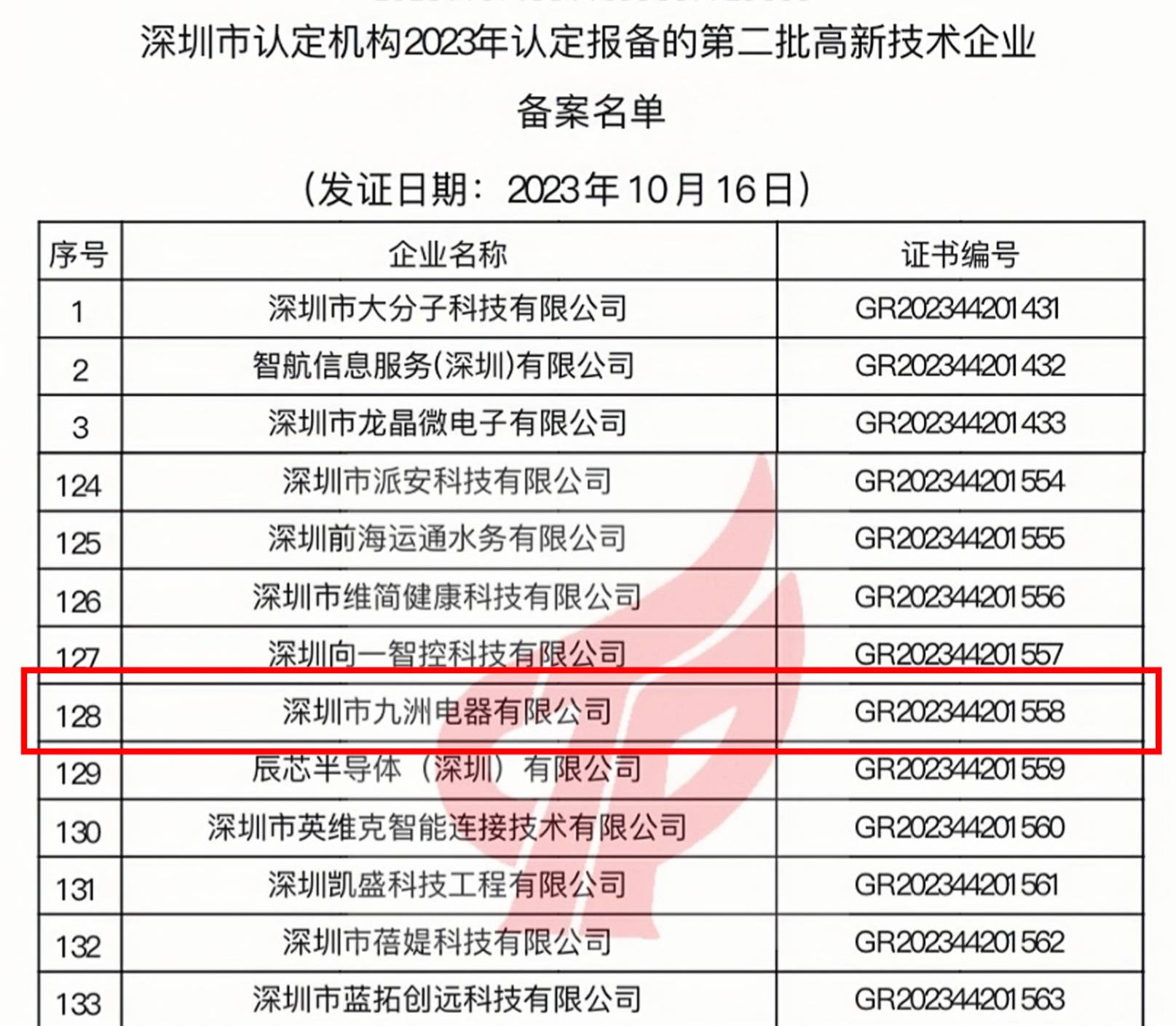 近日,全國高新技術企業(yè)認定管理工作領導小組辦公室發(fā)布關于《對深圳市認定機構2023年認定報備的第二批高新技術企業(yè)進行備案的公告》,經(jīng)過了申報、評審、公示,深圳九洲電器憑借專業(yè)的研發(fā)能力、雄厚的技術實力、持續(xù)的創(chuàng)新意識、以高質(zhì)量發(fā)展為前提的企業(yè)管理模式,順利通過國家級高新技術企業(yè)認定,成為2023年度深圳市第二批通過高新技術認定的企業(yè)。