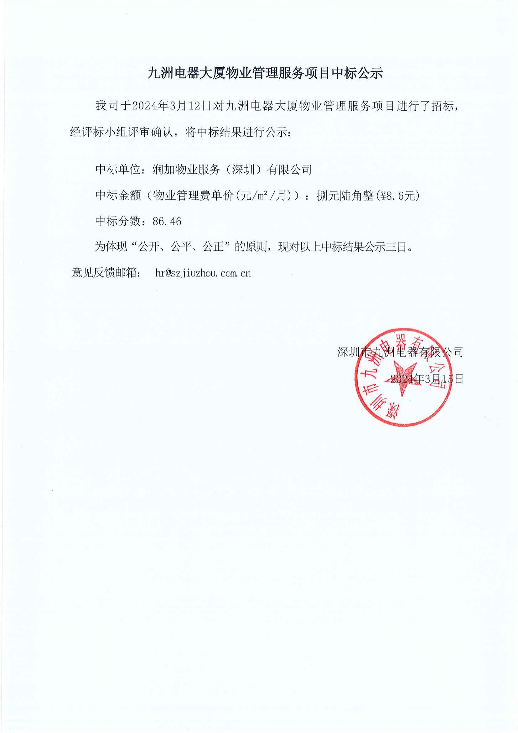 九洲電器大廈物業(yè)管理服務(wù)項目中標公示