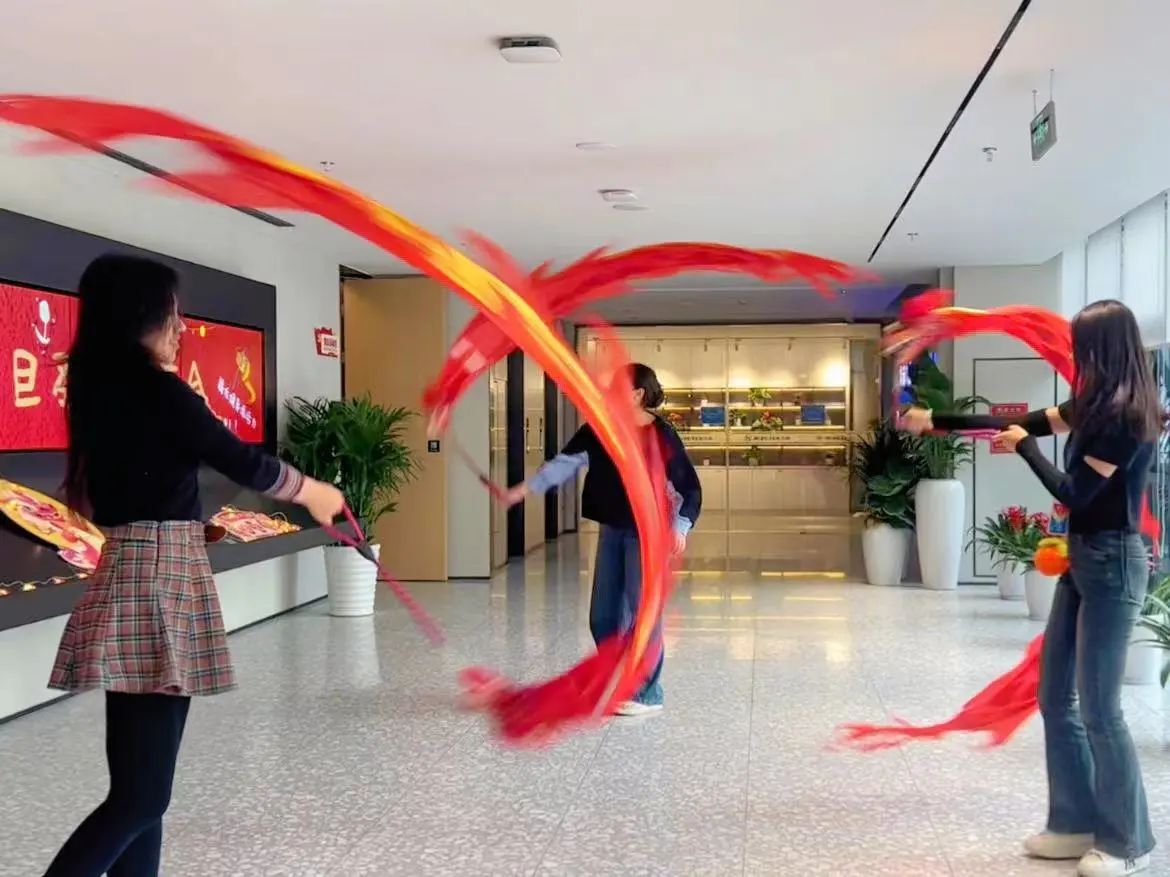 同事們有力地?fù)]動手中的短繩,龍頭彩帶飄逸靈動,讓一條條“游龍”在空中飛舞。